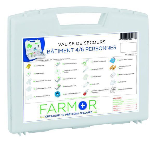 Valise composée selon les préconisations de l’OPPBTP. Poignée de transport, support mural et signalétique premiers secours. Permet d’apporter les premiers soins sur les chantiers aux équipes jusqu’à 6 personnes. | Dimensions : 240 x 205 x 48 mm