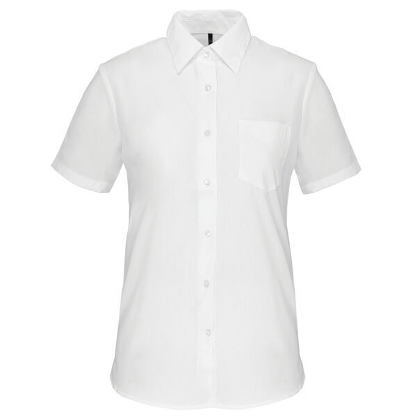 Chemise femme. Col chemise. Fermée par 7 boutons ton sur ton avec patte de boutonnage à revers. Poche poitrine. Manches courtes. Empiècement dos en double.
