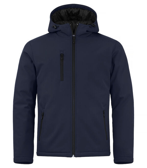 Softshell homme 3 couches matelassée. Capuche avec cordons de serrage élastiqué et stoppeurs. Fermeture devant par zips SBS retournés. Poche poitrine zippée. 2 poches basses zippées. Poche intérieure. Ouverture intérieure zippée pour faciliter le marquage. | Imperméable, respirant, coupe-vent. WP 5K.