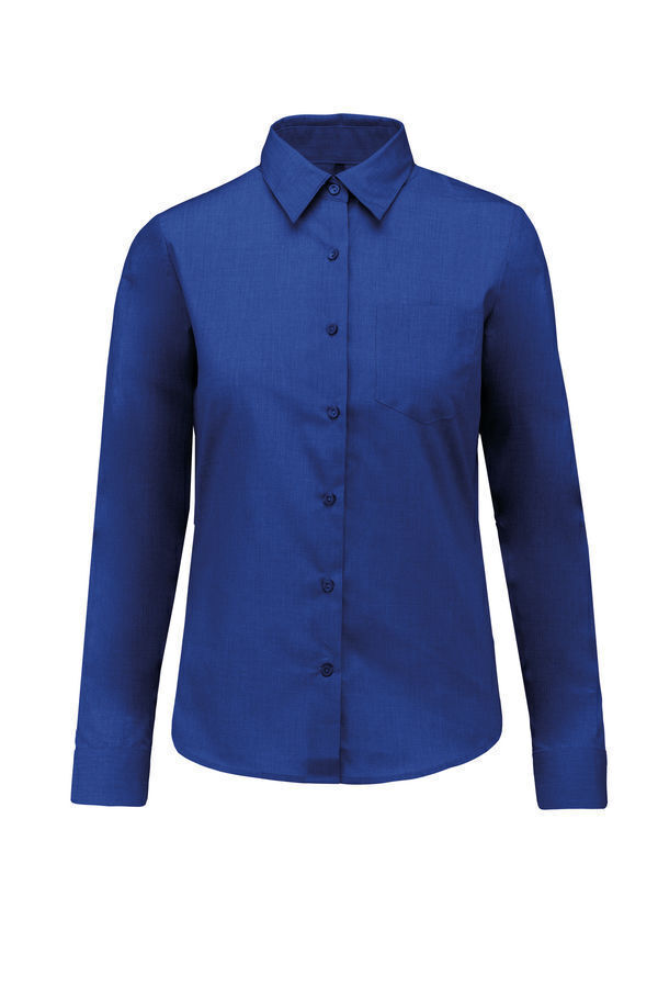 Chemise femme. Col chemise non boutonné. Boutons ton sur ton. Poche poitrine côté gauche en V. Poignet réglable à angles arrondis avec patte de manche indéchirable. 1 bouton de rappel. Bas arrondi.
