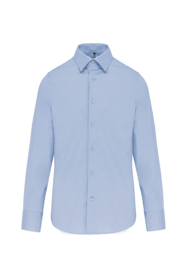 Chemise homme. Col avec pointe de col baleinée. Boutons ton sur ton. Empiècement dos double. Pinces taille dos. Finition coutures rabattues. Manches longues, poignets à angles abattus à 2 boutons avec patte de manche capucin boutonnée. 2 boutons de rappel. Bas arrondi.