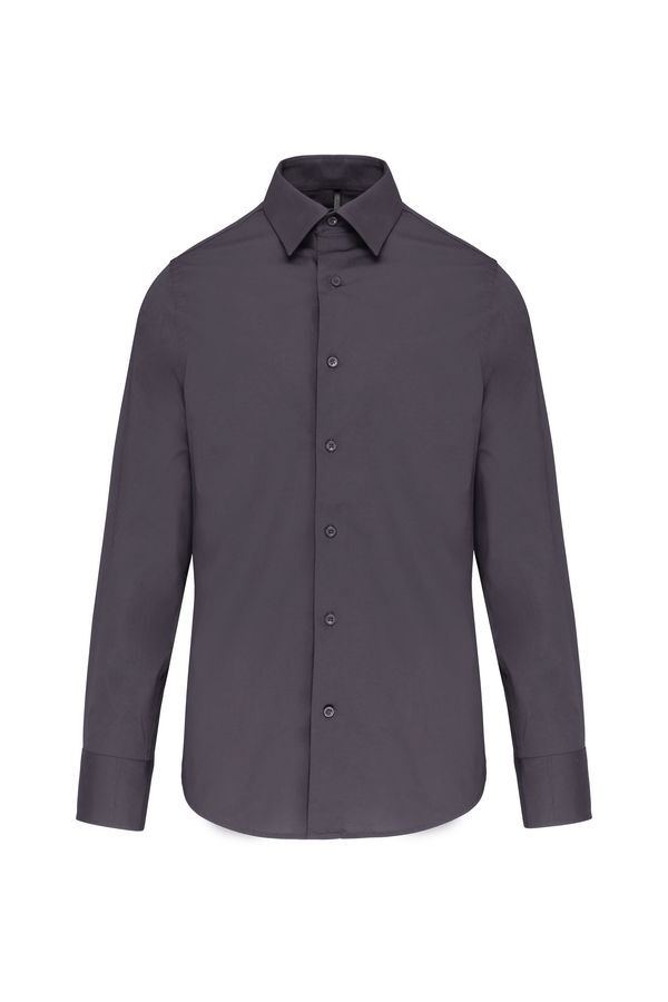 Chemise homme. Col avec pointe de col baleinée. Boutons ton sur ton. Empiècement dos double. Pinces taille dos. Finition coutures rabattues. Manches longues, poignets à angles abattus à 2 boutons avec patte de manche capucin boutonnée. 2 boutons de rappel. Bas arrondi.