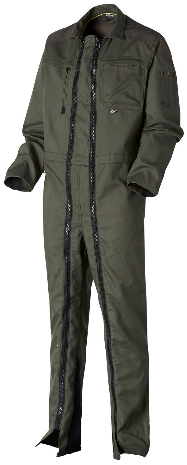 Combinaison. Col chevalière. Ouverture milieu devant double zips. 2 passe-mains fermeture auto-agrippant. Multiples poches dont 1 poche dos droit plaquée. Soufflets d’aisance dos. Taille dos élastiquée. EJ : 76 à 82 cm.