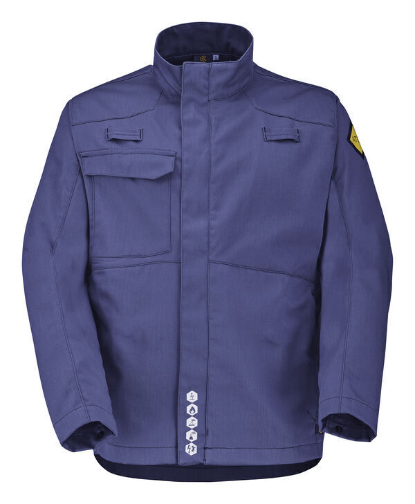 Blouson col droit. Fermeture centrale par boutons-pression sous rabat. 2 passants porte dosimètre. 1 poche poitrine et 2 poches basses à double entrée avec rabats fermés. Poche poitrine intérieure. Dos avec soufflet d'aisance et rallonge. Poignets à soufflets fermés par boutons-pression. Marquage sur ceinture gauche et manche droite. Mercerie plastique.