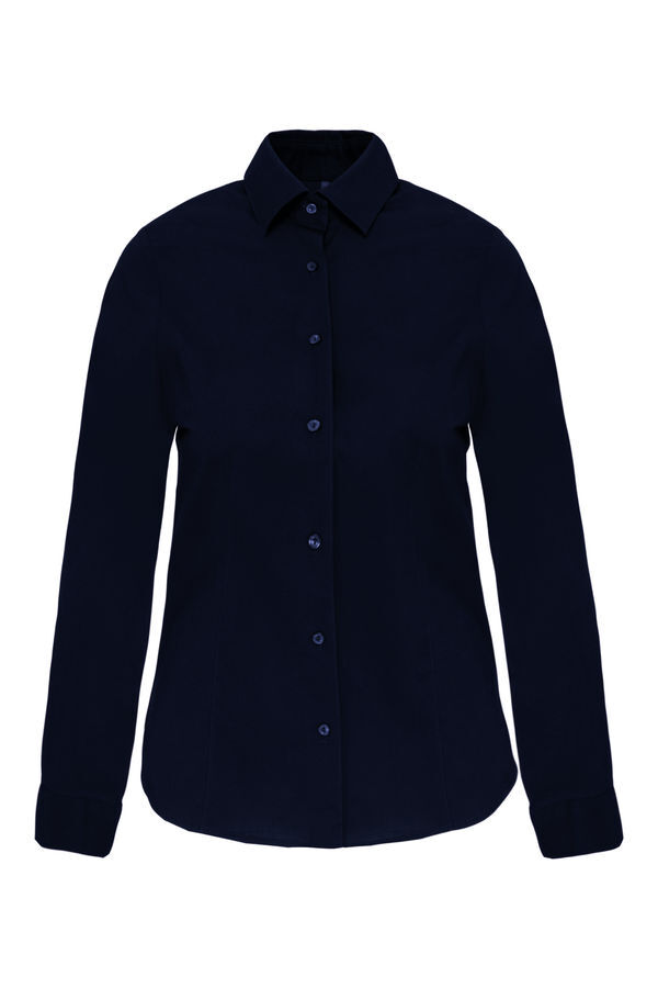 Chemise femme avec col chemisier. Manches longues, poignets réglables à angles abattus avec patte de manche indéchirable. 1 bouton de rappel. Bas arrondi.