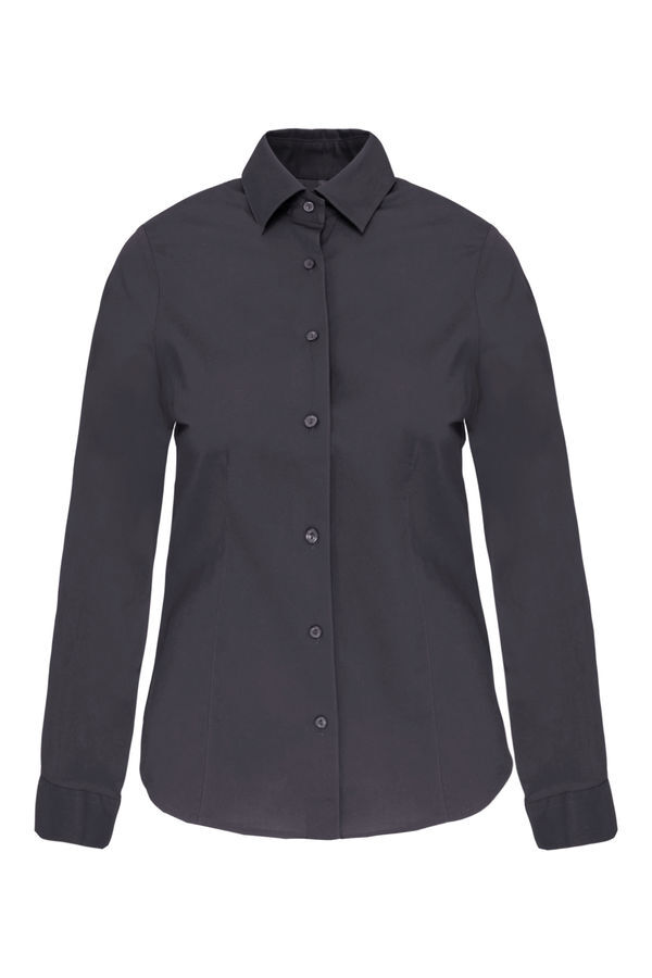 Chemise femme avec col chemisier. Manches longues, poignets réglables à angles abattus avec patte de manche indéchirable. 1 bouton de rappel. Bas arrondi.