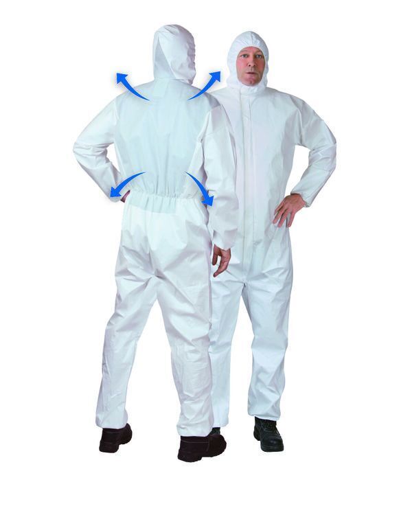 Combinaison modèle cousu. Capuche élastiquée. Taille, chevilles et poignets élastiqués. Rabat sur fermeture à glissière. Ruban adhésif sous rabat. Dos et arrière de la capuche en SMMS. Matière légère et aérée. Sachet individuel.