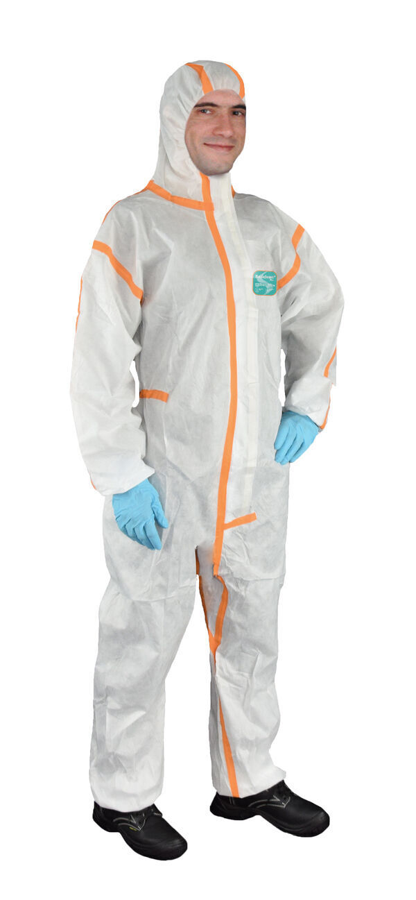 Combinaison avec coutures recouvertes par un film orange. Capuche élastiquée en 3 parties. Taille, chevilles, poignets élastiqués. Fermeture à glissière avec rabat adhésif. | Répond aux exigences du décret "EPI amiante".