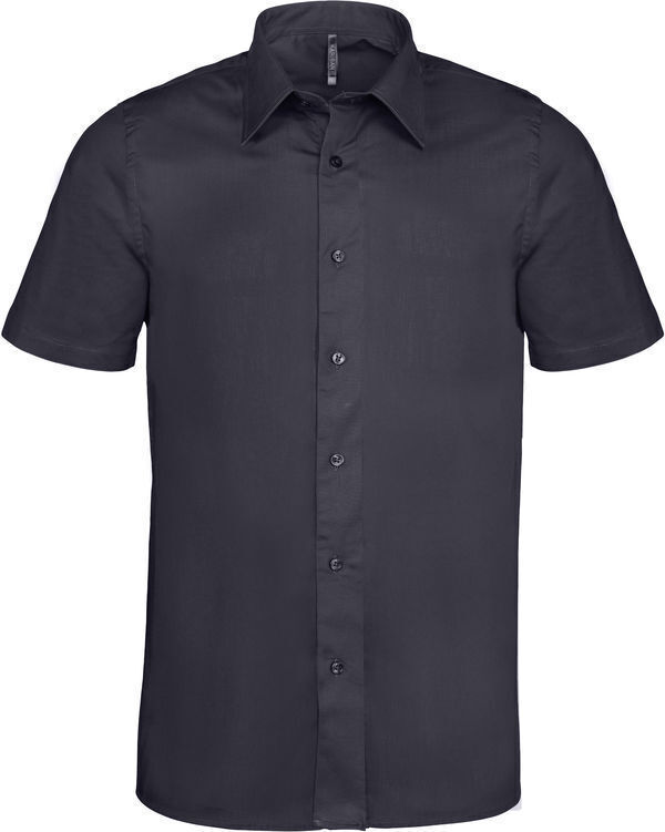Chemise homme. Pointe de col baleinée. Boutons ton sur ton. Empiècement dos double. Pinces taille dos. Finition coutures rabattues. Manches courtes, ourlet bas de manche double rempli. 1 bouton de rappel. Bas arrondi.
