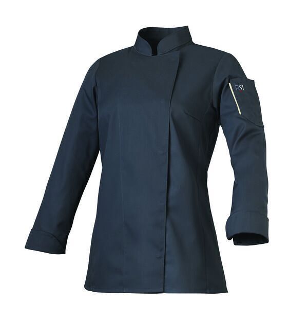 Veste femme à col officier. Fermeture asymétrique par pressions cachées. Découpes princesse devant et dos. Pinces poitrine. Poche sur manche gauche. Manches longues.