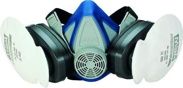 Demi-masque avec filtres à connexion baïonnette. Harnais textile et plastique.