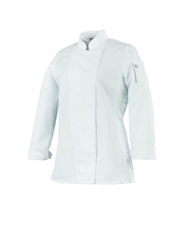 Veste femme à col officier. Fermeture asymétrique par pressions cachées. Découpes princesse devant et dos. Pinces poitrine. Poche sur manche gauche. Manches longues.