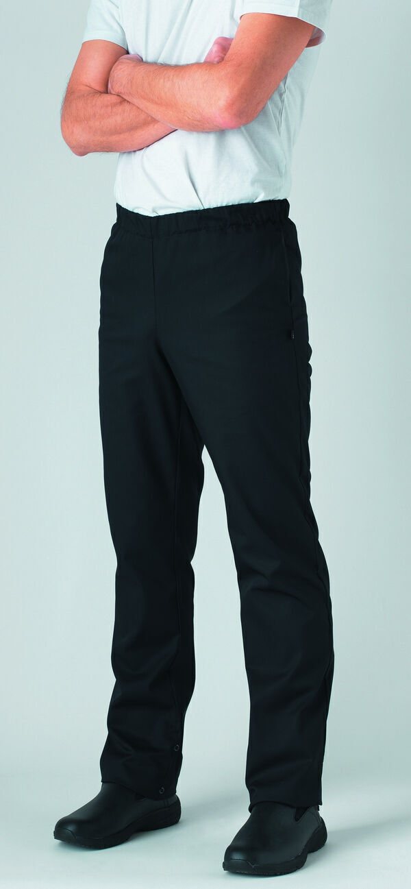 Pantalon à ceinture élastiquée. Poches côtés. Bas de jambes finies par ourlets, longueur réglable par pressions.