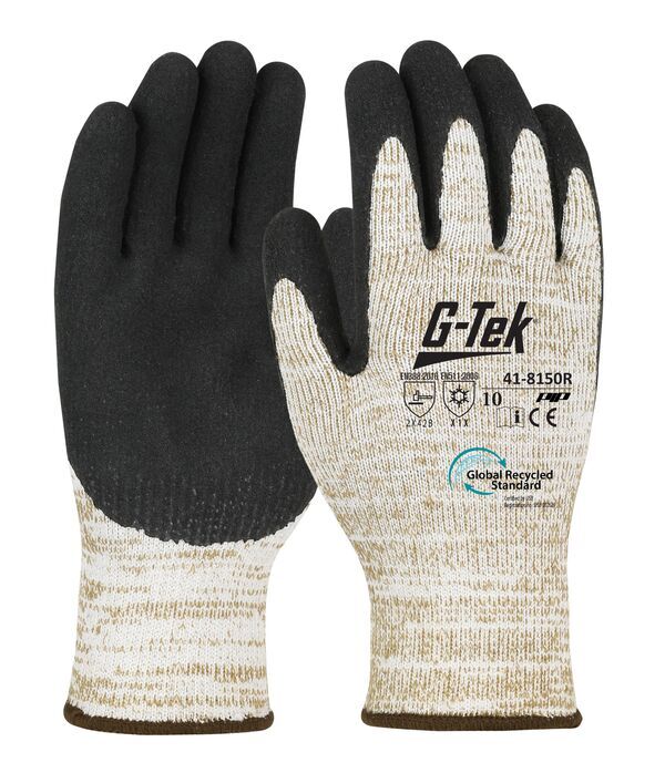 Gants support tricoté sans couture en PET recyclé à 90% et 10% d’acrylique pour la protection contre le froid. Enduction latex microsurface paume et doigts. Jauge 10. Certifié Global Recycled Standard.