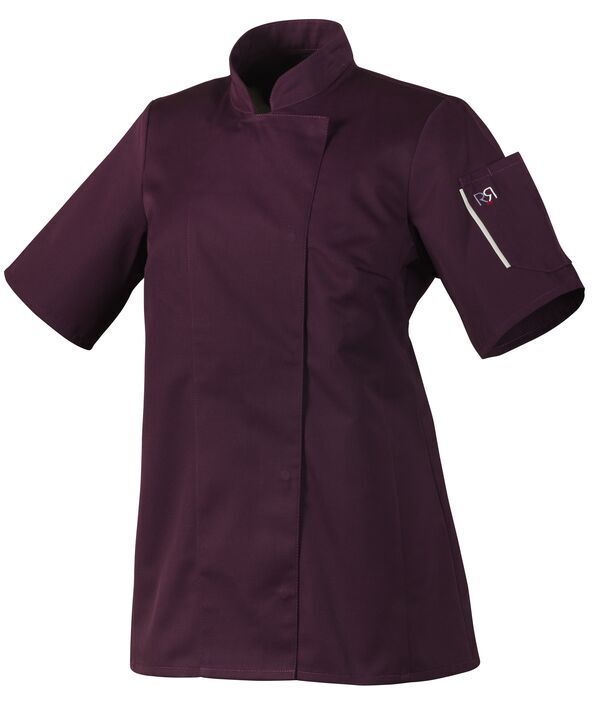 Veste femme à col officier. Fermeture asymétrique par pressions cachées. Découpes princesse devant et dos. Pinces poitrine. Poche sur manche gauche. Manches longues.