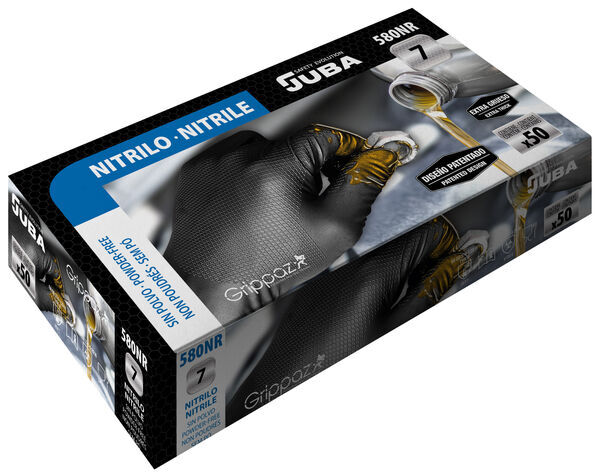 Gants jetables, en nitrile noir adhérisé "écailles" non poudrés. Épaisseur : 0,15 mm. Longueur : 24 cm. Boîte de 50 gants.