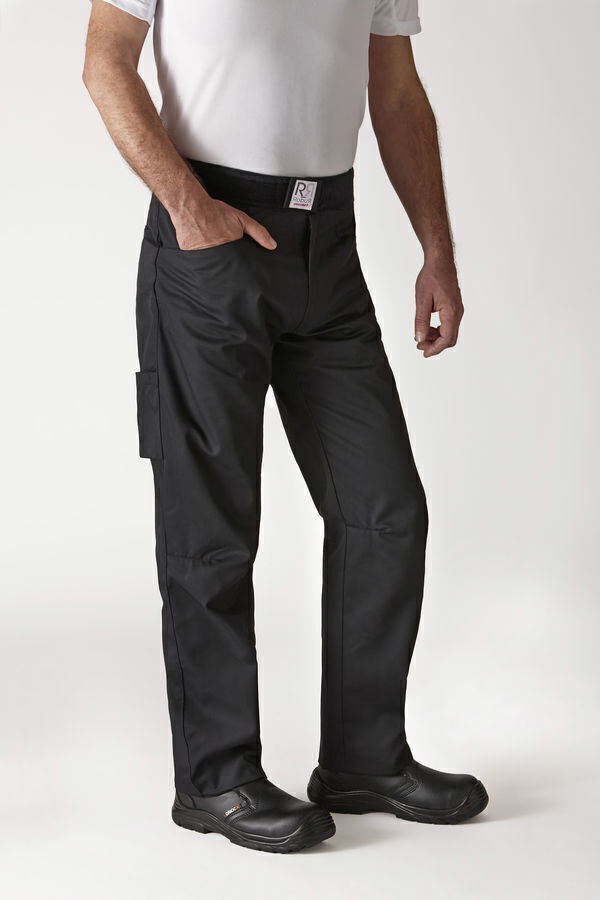 Pantalon mixte. Ceinture élastiquée réglable par bande auto-agrippante. Braguette à glissière. Poches cavalières. Poche dos. Poche téléphone sur la jambe fermée par auto-agrippant. Pinces genoux. Bas de jambes avec ourlet. E.J. : 83 cm.