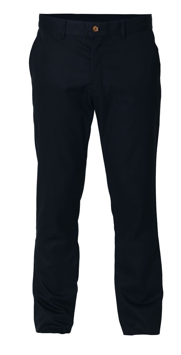 Pantalon homme. Ceinture fermée par 1 bouton cousu. Passants à la ceinture. Braguette fermée par zip. Poches italiennes. Poche arrière côté droit. Empiècement dos. Bas de jambes finis par ourlets. E.J. : 84 cm.