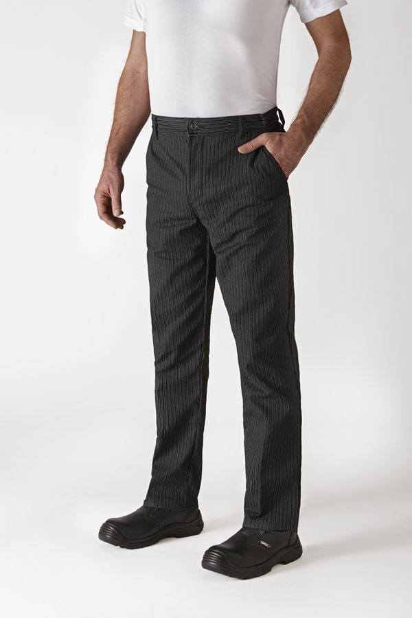 Tunique homme, col mao. Fermeture milieu devant par boutons-pression sous patte. Poche poitrine, 2 poches BIP, 2 poches basses dans découpe coté. Col et côtés contrastés. Manches courtes. Fentes cotés. Longueur : 78 cm.