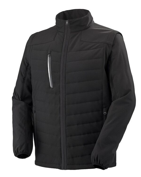 Veste hybride bi-matière softshell. Col montant. Fermeture centrale zippée. Poche poitrine zippée. Poches côtés à fermeture à glissière inversée. Réglage bas de veste par cordon élastiqué et stoppeur. Matelassage sur l'avant et le dos. Manches amovibles. Finition bas de manches élastiquée. Dos rallongé. | Point d'attache au col et bas de manche avec système modul'wear.