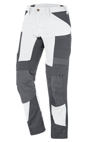 Pantalon à poches genouillères stretch bi-matière. Empiècements en tricot élastique aux côtés. Poche refermable pour téléphone portable, stylo, couteau et mètre pliant. Poche pour documents et élastique avec fermeture magnétique à bouton. 2 poches arrière à rabat. Empiècements jambes en matière stretch. Renforts genoux et poches, poche ouverture dessus pour emplacement de genouillère. Détails rétroréfléchissants. E.J.: 84 cm. 3 longueurs disponibles.