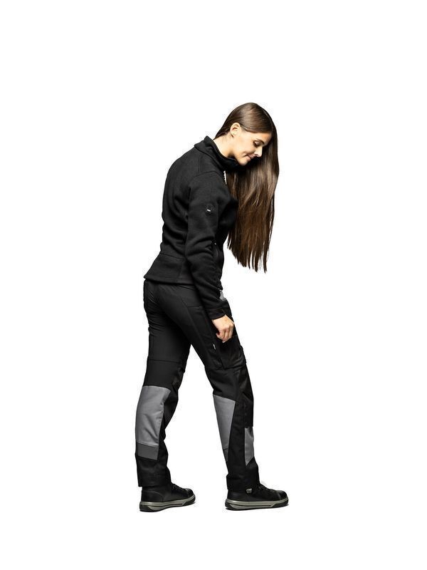 Pantalon à poches genouillères stretch bi-matière. Empiècements en tricot élastique aux côtés. Poche refermable pour téléphone portable, stylo, couteau et mètre pliant. Poche pour documents et élastique avec fermeture magnétique à bouton. 2 poches arrière à rabat. Empiècements jambes en matière stretch. Renforts genoux et poches, poche ouverture dessus pour emplacement de genouillère. Détails rétroréfléchissants. E.J.: 84 cm. 3 longueurs disponibles.