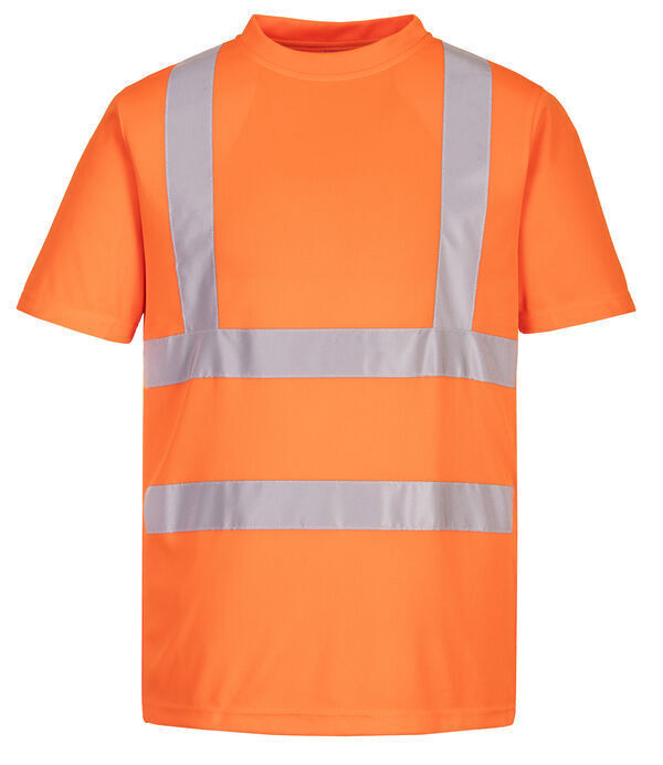 T-shirt haute-visibilité. Espace de bande de 4 cm sur les coutures latérales permettant l'étirement du vêtement. Bandes cousues. Coupe ajustée.