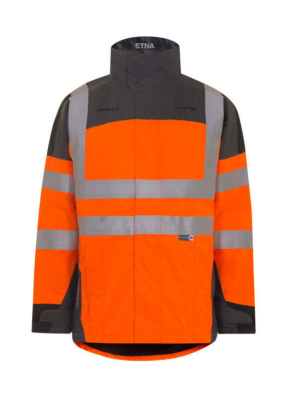Parka avec fermeture à glissière, sous rabat fermé par 6 boutons-pression. Passe-mains fermés par 2 auto-agrippant non feu et 2 boutons-pression. 2 poches basses avec rabat fermé par zip. Poche Napoléon zippé sous rabat central. Poche portable intérieure fermée par bouton-pression. 2 pattes de fixation poitrine pour micro déporté. Manches préformées. Dos protège-reins. Bas de manches avec patte de serrage par boutons-pression. 2 ceintures, 2 bretelles et 4 brassards rétroréfléchissants microbilles RETHIOTEX® non feu de 5 cm cousus. Trappe de marquage. | Mercerie tout plastique. Système d’accueil capuche optionnelle KACHUCHA. Fit&Zip : système de zip et pattes d’accroches pour fixation du gilet ETNA ou de la polaire CALDERA.