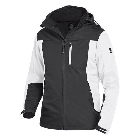 Veste softshell stretch bicolore homme. Capuche amovible et réglable. Col montant. Fermeture centrale par zip YKK® avec protège-menton. Poche poitrine zippée. 2 poches basses zippées dans la découpe. Poignets ajustables par patte auto-agrippante. Doublé polaire. | Détails rétroréfléchissants. Coupe ajustée. Imperméabilité et respirabilité : 10000/5000.