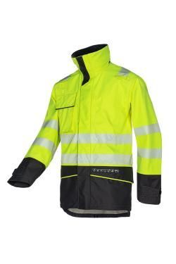 Parka homme étanche. Col droit. Accroche-capuche. Fermeture YKK® sous rabat avec bande auto-agrippante. Système de préhension bas de zip facilitant l'utilisation. 1 poche poitrine plaquée, 2 poches plaquées, 2 porte-dosimètre. 1 poche Napoléon. 2 poches intérieures. Cordon serrage. Pan dorsal rallongé. Manches montées, rétrécissement par fermeture auto-agrippante et extrémités préformées. Bande réfléchissante segmentée ignifugée (50 mm). Sans doublure. | Longueur dos : 85 cm. Possibilité de fixer la softshell par fermeture à glissière.