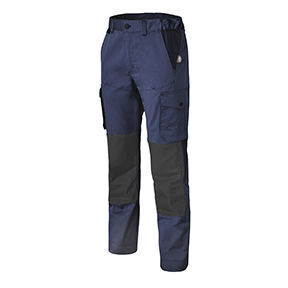 Pantalon à poches genouillères. Ceinture élastiquée côtés fermée par bouton plastique noir, 5 passants dont 2 plus larges dans le dos. Braguette à glissière. Dos couvre-rein. Poches italiennes à coins cassés. Découpes ergonomiques contrastés. Accroche clefs. Poche plaquée dos, bas volant. 2 poches cuisses plaquées, avec compartiments stylo et mètre, rabat pressionné. 2 poches genouillères avec pinces surpiquées, fermées par Velcro®. Jambes préformées. E.J. : 80 cm (+ 5 cm).