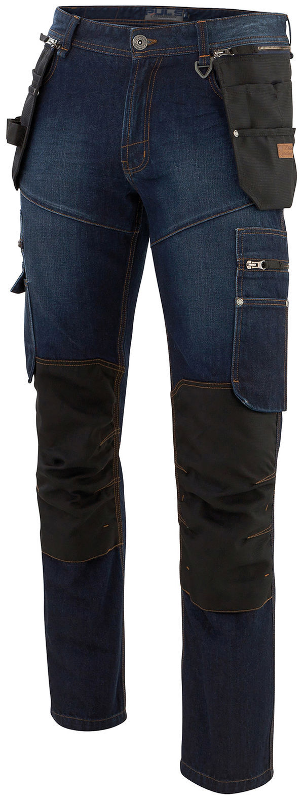 Jean poches holster. Braguette zippée. Ceinture 5 passants dont un double milieu dos. Rehausse dos. Poches porte-outils amovibles par zip. Poche ticket, 2 poches cavalières, 2 doubles poches côtés avec zip, compartiments pour smartphone avec rabat pressionné, 2 poches dos. Sangle côté accroche marteau. Poches genouillères avec renforts Polyamide et système de réglage (2 niveaux, plaques certifiées EN14404 REF.GN08). Triple surpiqûres. Points d’arrêts renforcés. Coupe ajustée. E.J. : 82cm
