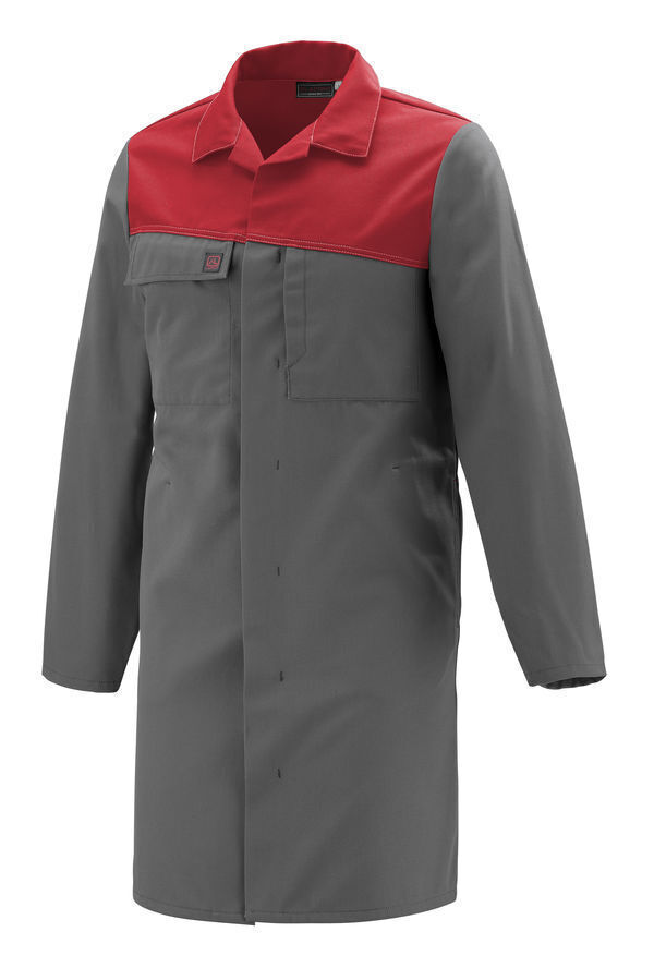 Blouse. Col transformable. Collerette de marquage. Empiècements devant et dos obliques. Devant fermé par pressions cachées. Manches montées. Poche poitrine droite incrustée sous rabat fermé par Velcro® cachés. Poche poitrine gauche avec ouverture verticale fermée par Velcro® caché. Poches basses insérées dans coutures côtés. Fonds de poches maintenus par point d’arrêt. Bas de manches réglables par pression. Fente dos. Mercerie tout plastique. Surpiqûres contrastées.