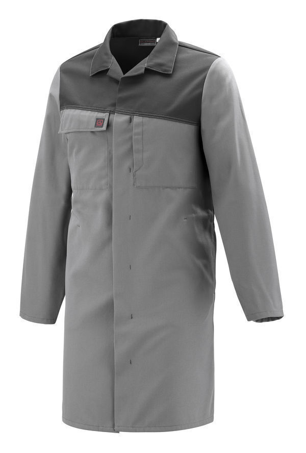 Blouse. Col transformable. Collerette de marquage. Empiècements devant et dos obliques. Devant fermé par pressions cachées. Manches montées. Poche poitrine droite incrustée sous rabat fermé par Velcro® cachés. Poche poitrine gauche avec ouverture verticale fermée par Velcro® caché. Poches basses insérées dans coutures côtés. Fonds de poches maintenus par point d’arrêt. Bas de manches réglables par pression. Fente dos. Mercerie tout plastique. Surpiqûres contrastées.