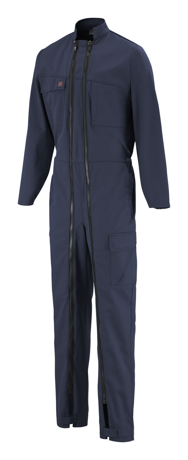Combinaison double zip. Col officier. Collerette de marquage. Fermeture par double fermeture à glissière. Empiècements devant et dos obliques. Poche poitrine droite incrustée sous rabat fermé par Velcro® cachés. Poche poitrine gauche avec ouverture verticale fermée par Velcro® caché. Manches montées. Bas de manches réglables par pressions. Elastiques côtés. Poche revolver plaquée. Poches italiennes et passe-mains fermés par Velcro®. Poche mètre bas volant. Poche cuisse gauche à soufflet, sous rabat fermé par Velcro® cachés. Bas de jambe évolutifs avec pattes de serrage à Velcro®. Surpiqûres contrastées. Mercerie tout plastique. E.J. : 82 cm (+ 5 cm).
