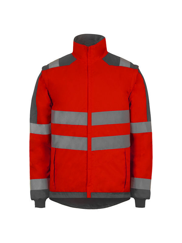 Blouson haute visibilité. Fermeture centrale à glissière avec curseur réversible pour fixation à la parka KITA®. 2 poches basses avec rabat, fermées par fermeture à glissière. Manches préformées amovibles et poignets en bord-côte avec patte d'accrochage. Dos protège-reins. Trappe d'accès pour le marquage. | Bandes microbilles rétroréfléchissantes de largeur variable selon les tailles.