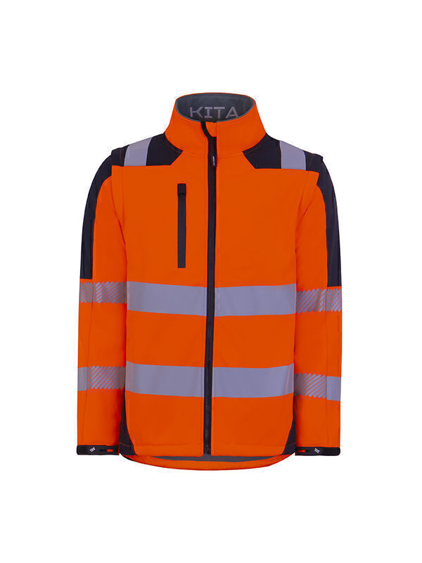 Softshell haute visibilité 3 couches. Fermeture par glissière jusqu’en haut du col avec mentonnière. Curseur réversible pour fixation à la parka KITA®. 2 poches basses, poche poitrine fermée par glissière, 2 poches intérieures fermées par auto-agrippant. Dos couvre-reins. Manches préformées et amovibles par glissière. Blouson relevé de 2 ceintures, 2 brassards et demi-bretelles rétroréfléchissantes segmentées.