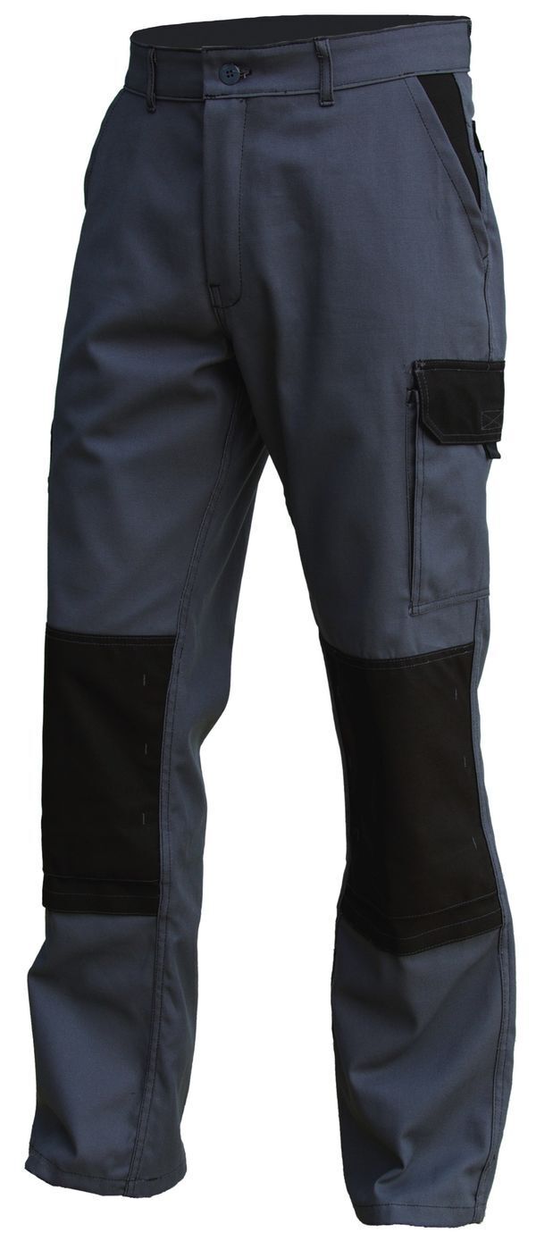 Pantalon à poches genouillères bicolore. Ceinture élastiquée dos et boutonnière de réglage intérieure. Braguette à glissière nylon. Pinces dos. 2 poches italiennes sac de poche dans le même tissu et entrée de poche noire. 1 poche cuisse à soufflet rabat fermé par Velcro®. Double-poche porte-outils, accroche-marteau. Poche téléphone. Poche dos rabat Velcro®. Poches genouillères Cordura® 2 positions fermées par bandes Velcro®. E.J. : 82 cm.
