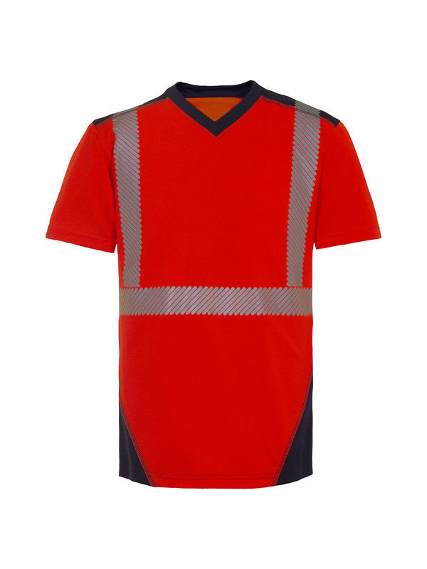 T-shirt haute visibilité. Col V contrasté. Manches courtes. Empiècement maille ajourée contrastée sous les bras. | Bandes rétroréfléchissantes segmentées microbilles thermocollées. Maille polyester transfert d’humidité et anti UV UPF 40+. Coupe cintrée.