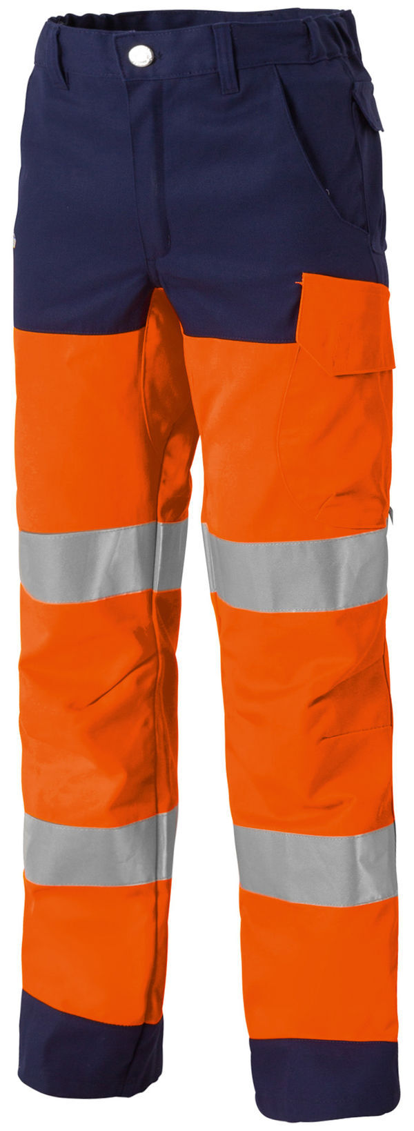 Pantalon haute visibilité homme. Ceinture élastiquée côtés, 5 passants, fermée par bouton rivet et fermeture à glissière. 2 poches italiennes. Poche cuisse gauche plaquée, rabat fermé par auto-agrippant. Poche téléphone côté gauche à rabat fermé par auto-agrippant. Poche dos et 1 poche mètre plaquées. Boucle marteau. Empiècement d’aisance entrejambe. Genoux préformés. | Bandes rétroréfléchissantes 70 mm. E.J. : 78 et 84 cm.