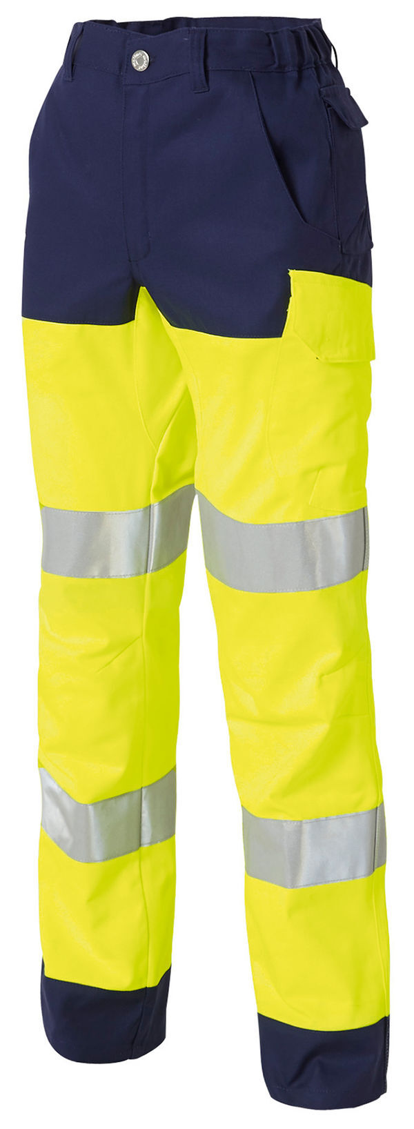 Pantalon haute visibilité homme. Ceinture élastiquée côtés, 5 passants, fermée par bouton rivet et fermeture à glissière. 2 poches italiennes. Poche cuisse gauche plaquée, rabat fermé par auto-agrippant. Poche téléphone côté gauche à rabat fermé par auto-agrippant. Poche dos et 1 poche mètre plaquées. Boucle marteau. Empiècement d’aisance entrejambe. Genoux préformés. | Bandes rétroréfléchissantes 70 mm. E.J. : 78 et 84 cm.