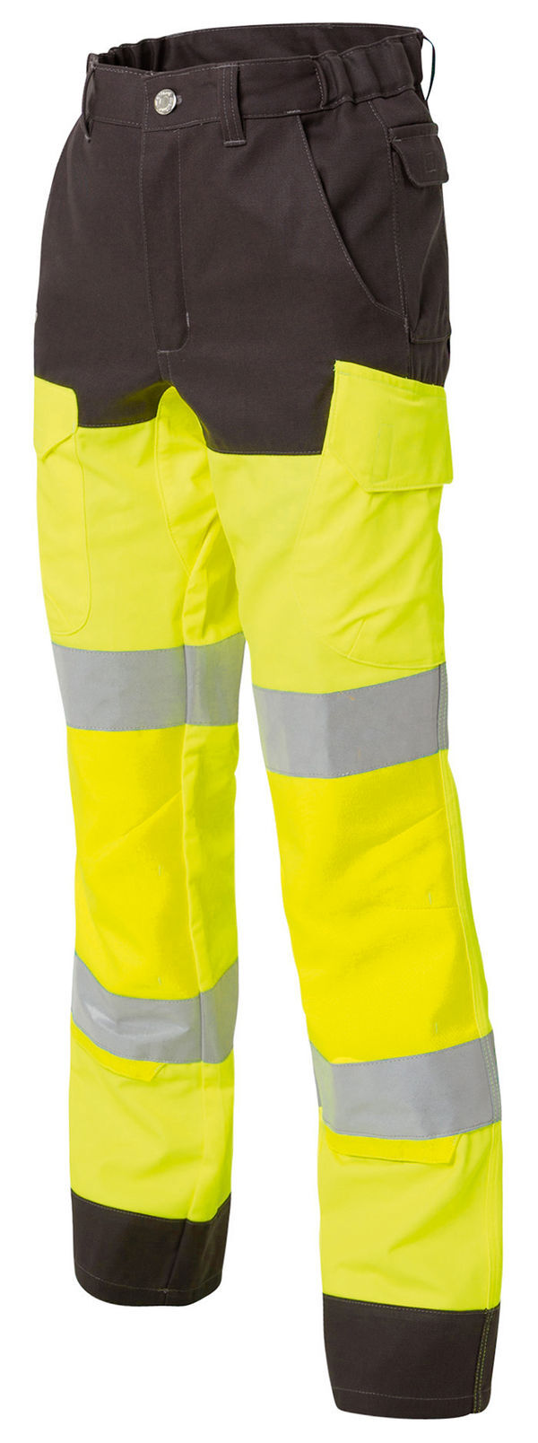 Pantalon haute visibilité avec poches genouillères. Ceinture 5 passants, élastiquée côtés, fermée par bouton rivet et fermeture à glissière. 2 poches italienne. Poche cuisse gauche plaquée, rabat fermé par auto-agrippant. Poche téléphone côté gauche à rabat fermé par auto-agrippant. 1 poche dos et 1 poche mètre plaquées. Boucle marteau. Empiècement d’aisance entrejambe. Genoux préformés. 2 bandes rétroréfléchissantes 70mm bas de jambes. E.J. : 78 & 84cm