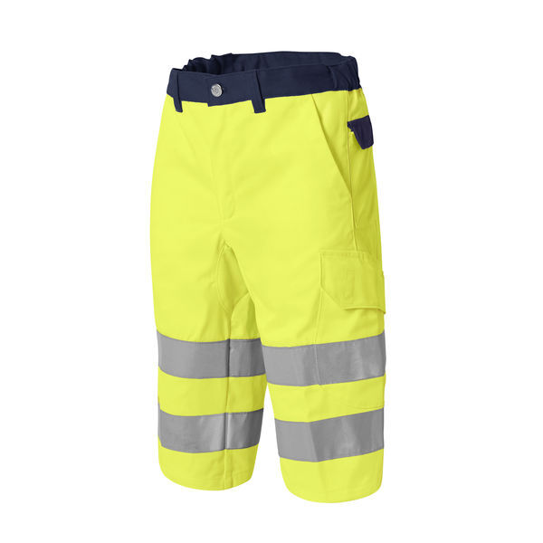 Bermuda haute visibilité. Ceinture élastiquée côtés. 2 poches italiennes. 2 pinces dos. 1 poche dos et poche mètre plaquées. Empiècement d’aisance entrejambe. | E.J. : 35 cm.