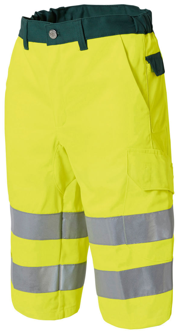 Bermuda haute visibilité. Ceinture élastiquée côtés. 2 poches italiennes. 2 pinces dos. 1 poche dos et poche mètre plaquées. Empiècement d’aisance entrejambe. | E.J. : 35 cm.