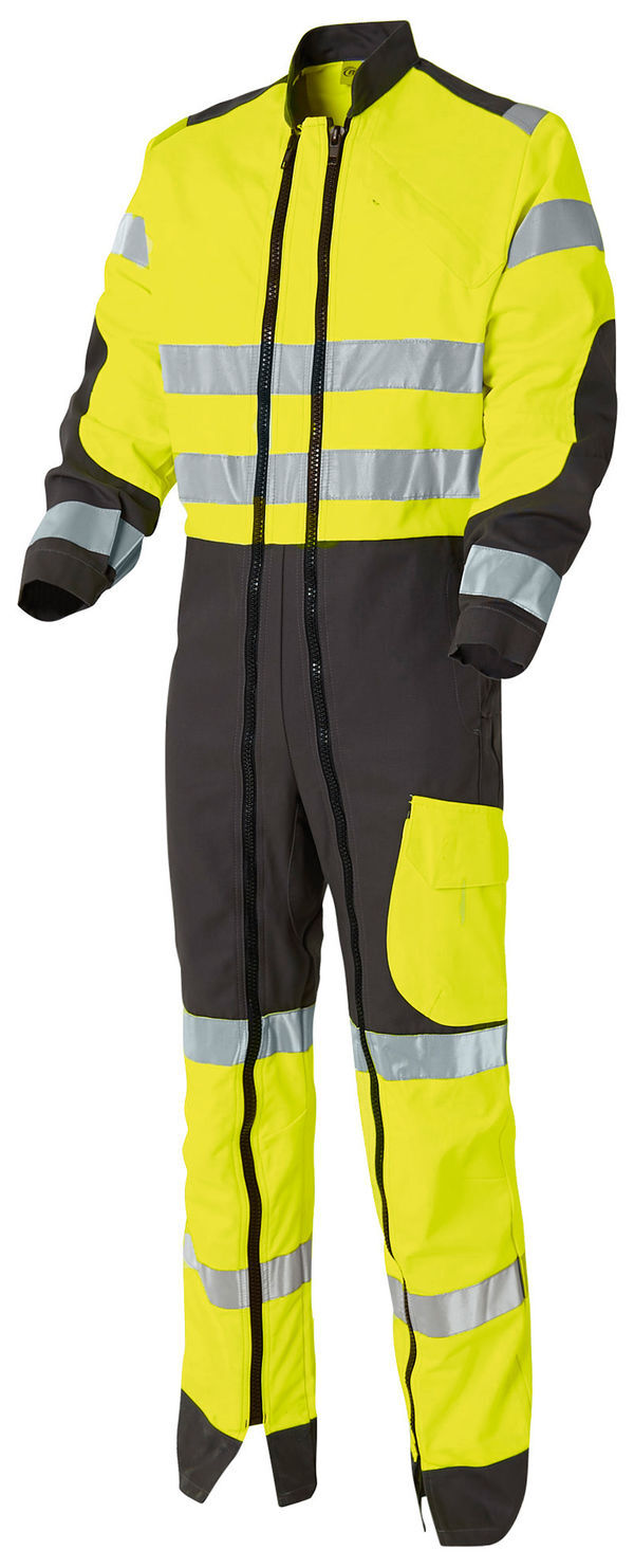 Combinaison haute visibilité. Col montant. Fermeture double glissière. Ceinture dos élastiquée réglable. Coudes préformés. Poignets pressionnés réglables. Poche poitrine avec zip et rabat. Poche portefeuille fermeture à velcro. Passe mains (fermeture par pressions). Poche téléphone. Grande poche arrière. Poche cuisse avec rabat velcro. Sangle porte-outils. Poche mètre. Empiècement d'aisance à l'entrejambe. Genoux préformés. | E.J. : 76 et 82 cm