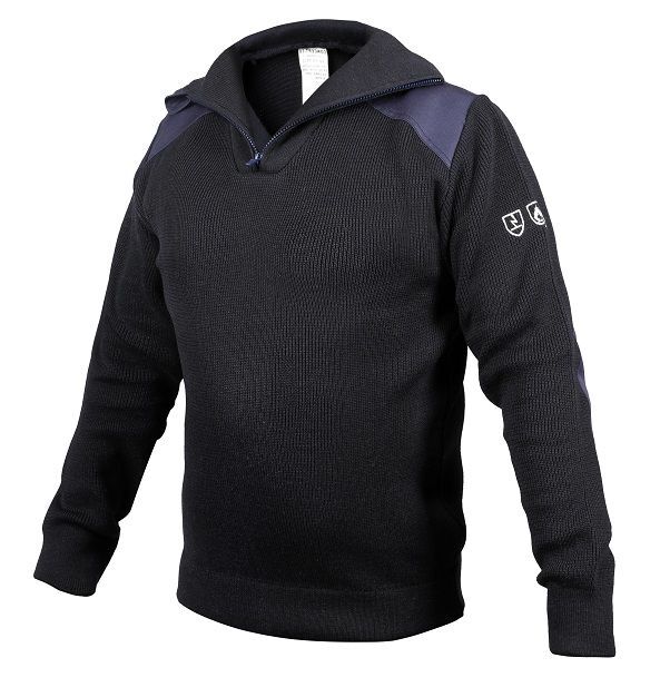Pull col camionneur multirisques. Maille perlée chevalée Jauge 8. Bord-côte 1/1 Double. Renforts coudes et épaules en tissu Non Feu.