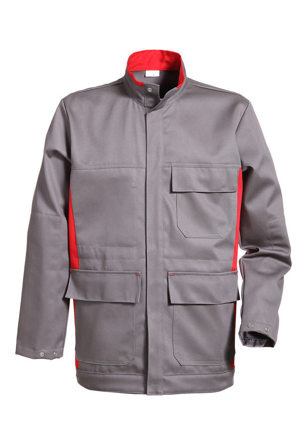 Veste bicolore. Col montant. Manches montées avec bas de manches réglables par grippers 2 positions. Fermeture devant par 6 grippers sous patte. Empiècement devant et dos. Empiècements côtés contrastés. 1 poche poitrine côté gauche fermée par rabat à grippers cachés. 1 poche intérieure côté droit. 2 poches basses fermées par rabats à grippers cachés. Ceinture avec un couvre reins, pattes de réglages à grippers 2 positions. Bas devant et bas de manches avec renfort intérieur du même tissu.