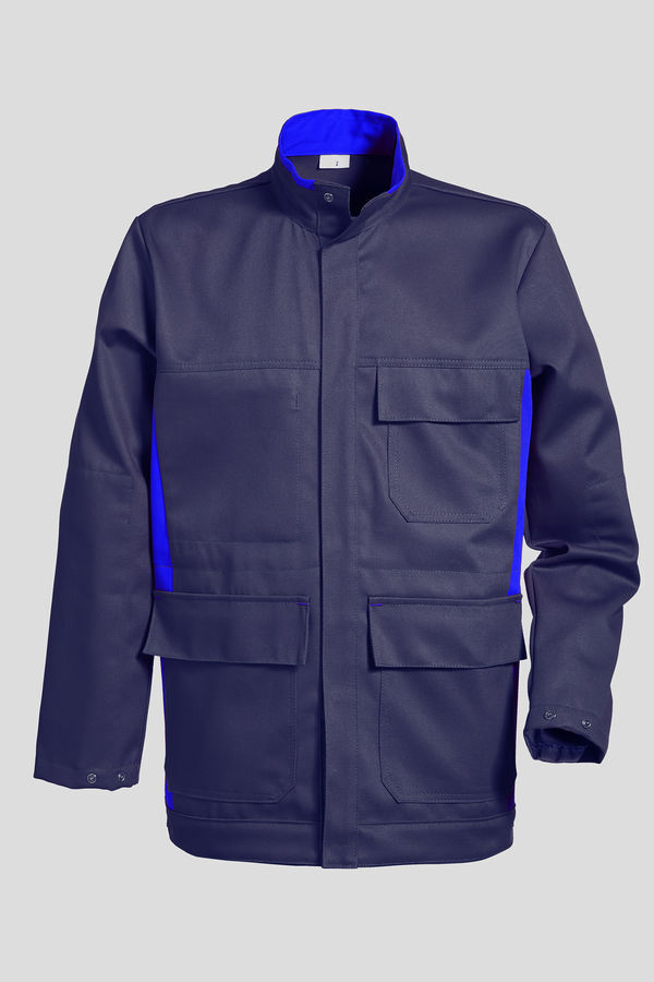 Veste bicolore. Col montant. Manches montées avec bas de manches réglables par grippers 2 positions. Fermeture devant par 6 grippers sous patte. Empiècement devant et dos. Empiècements côtés contrastés. 1 poche poitrine côté gauche fermée par rabat à grippers cachés. 1 poche intérieure côté droit. 2 poches basses fermées par rabats à grippers cachés. Ceinture avec un couvre reins, pattes de réglages à grippers 2 positions. Bas devant et bas de manches avec renfort intérieur du même tissu.