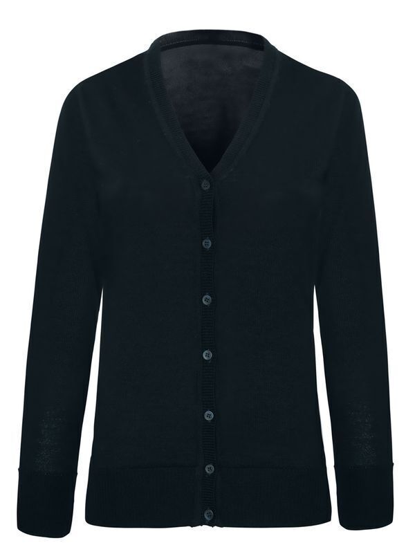 Cardigan encolure V femme. Bord-côte 2/2 corps et manches, bande de boutonnage tubulaire remaillée. Maille jersey jauge 12.