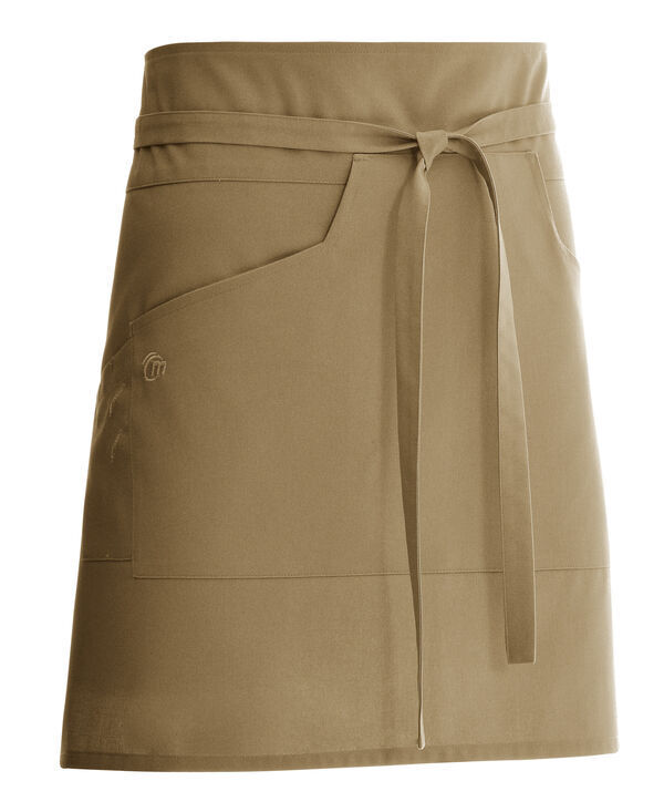 Tablier court. Empiècement ceinture. Grande poche centrale à double entrée. Poche côté avec compartiment stylo avec 2 boutonnières. | Longueur : 45 cm.